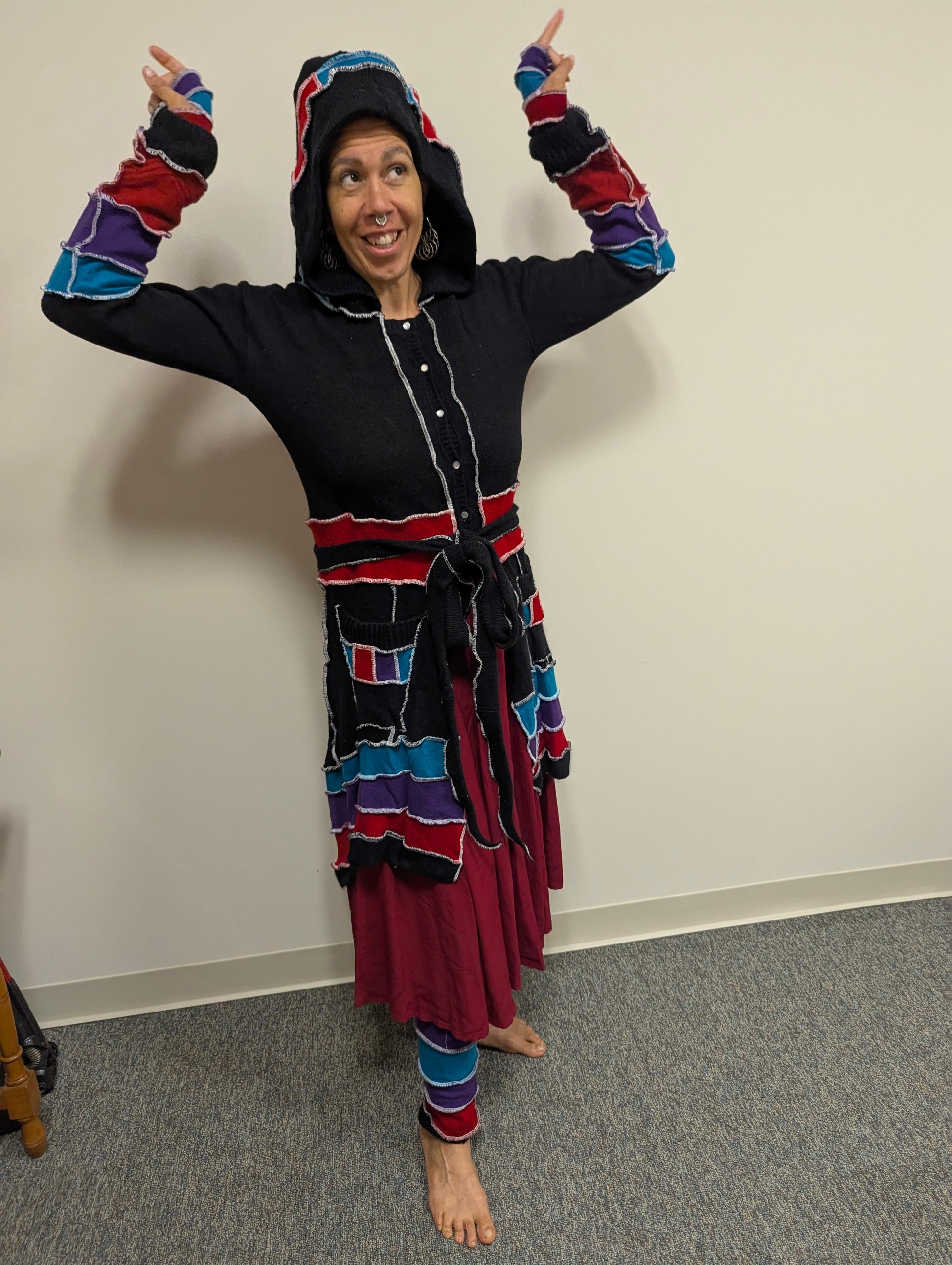 This wool blend sweater coat was inspired by the Shipibo Conibo people's embroidery work. Their color palettes have taught me to step outside of my well worn aesthetic into the boldness of their colorful world. 10% of this sale will go to Jason Rate Retreat Center's reforestation project near Pucallpa Peru. More information here.